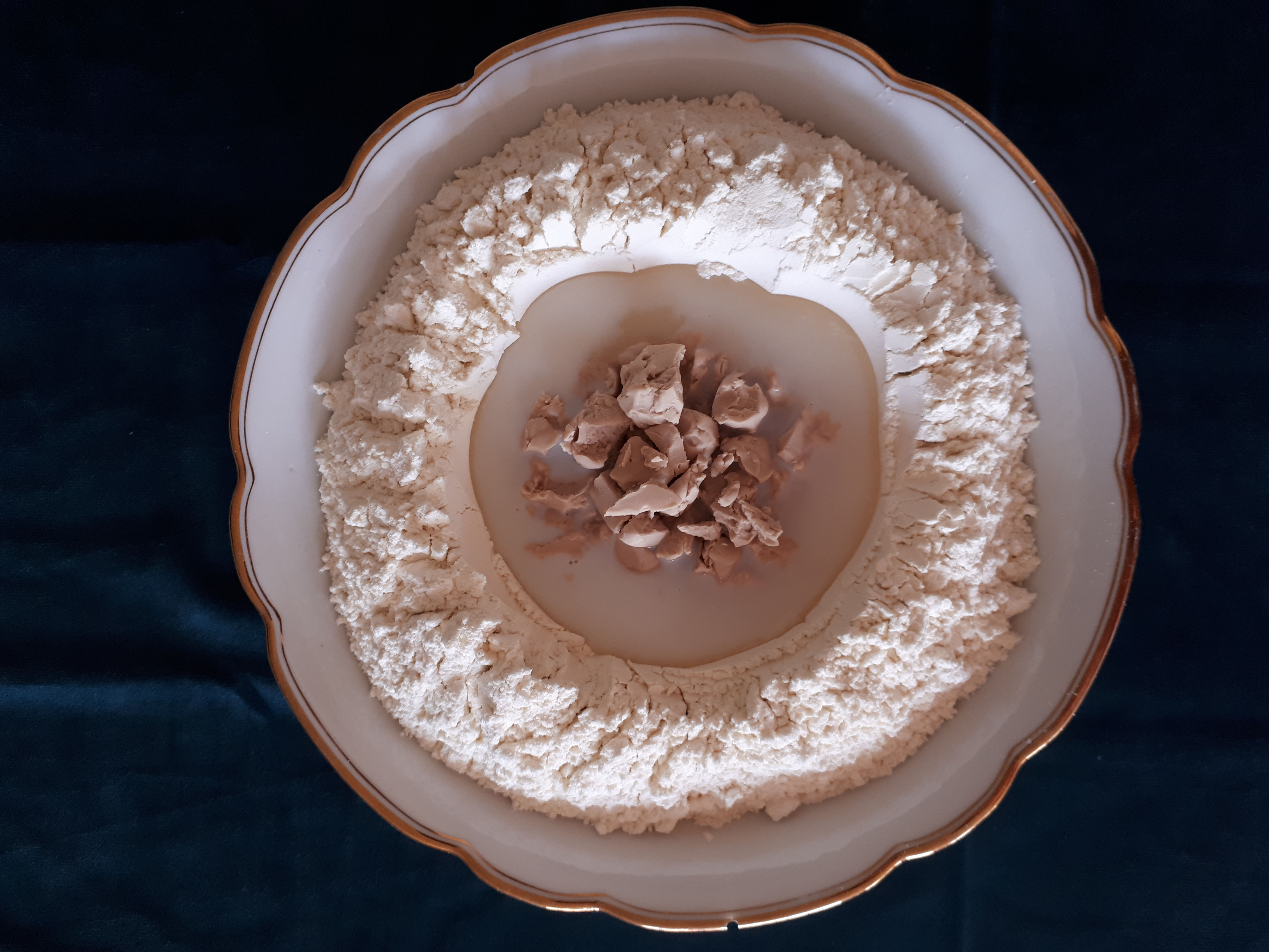 Nun die Hefe mit den Fingern in die Schüssel hineinbröseln und dann die lauwarme Milch Mischung darüber gießen das Ei dazu geben und alles für etwa 10 Minuten zu einem festen.